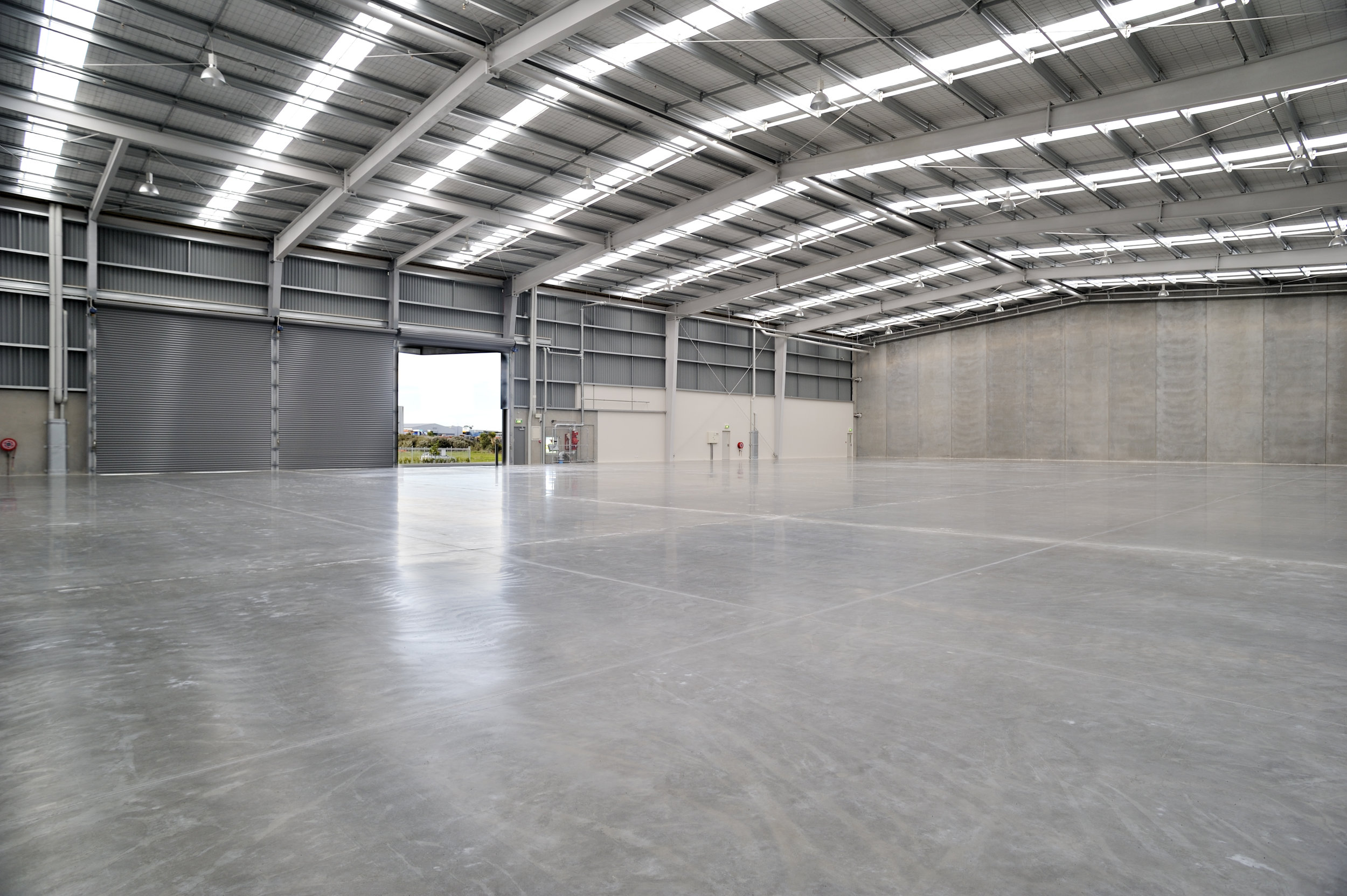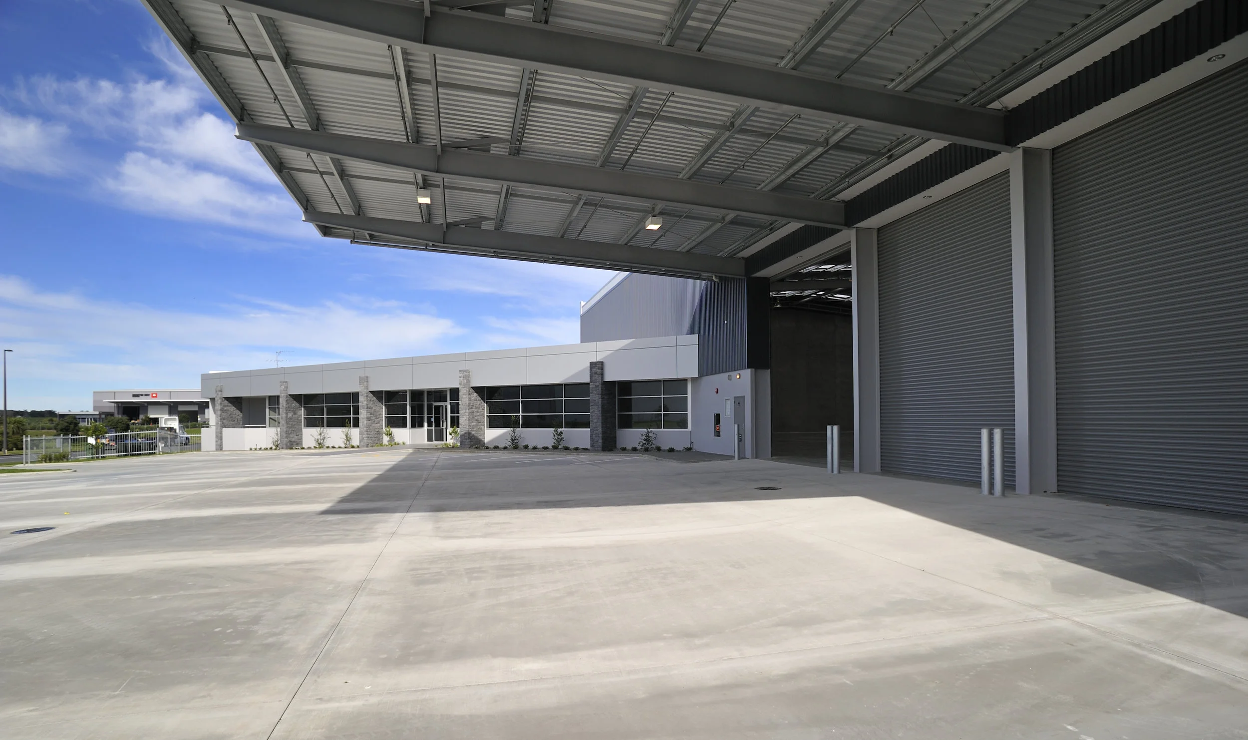 9m stud, clear span dual access driveway with 6m x 6m roller door access.